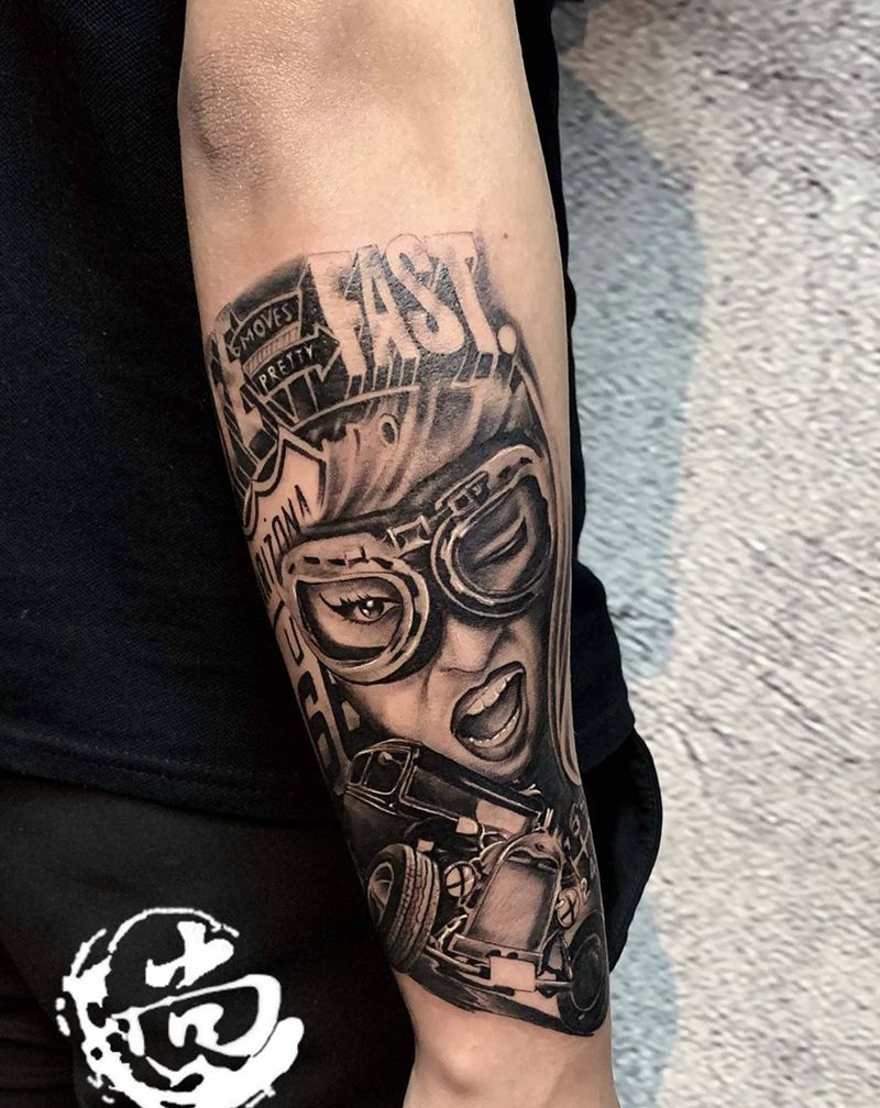 欧美老爷赛车大妞纹身图片_手臂欧美写实纹身图案