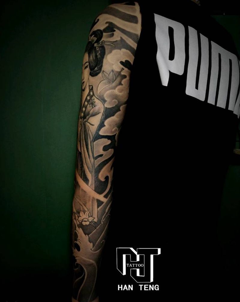 当前位置: 首页 >甘肃省天水市纹身店-瀚腾刺青纹身图案>艺伎花臂纹身图片_手臂新传统艺伎牡丹水浪纹身图案