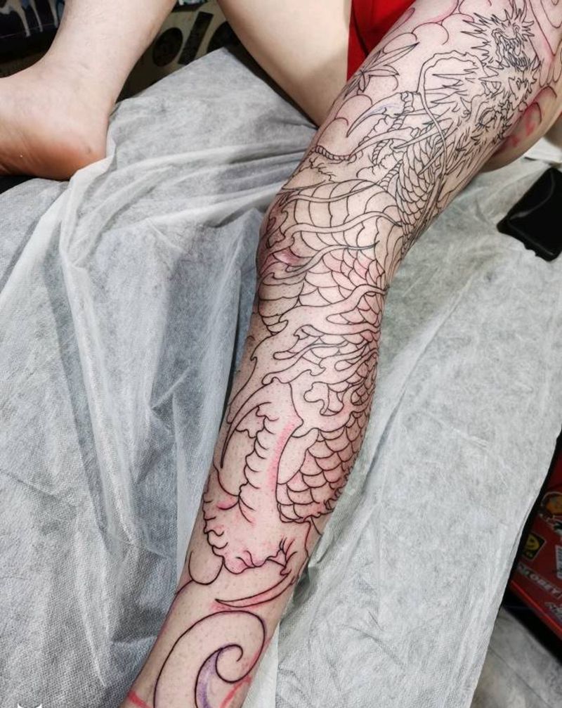 • T网红王老大花腿龙纹身图片_腿部新传统纹身图案