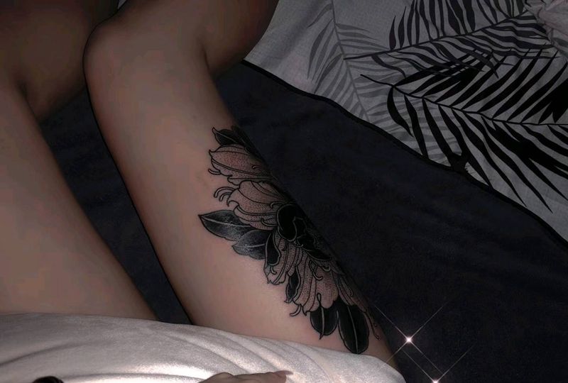 大腿牡丹纹身图片_腿部点刺图腾牡丹纹身图案
