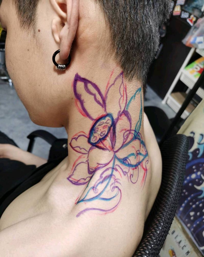 荷花纹身图片_颈部肩部新传统荷花纹身图案