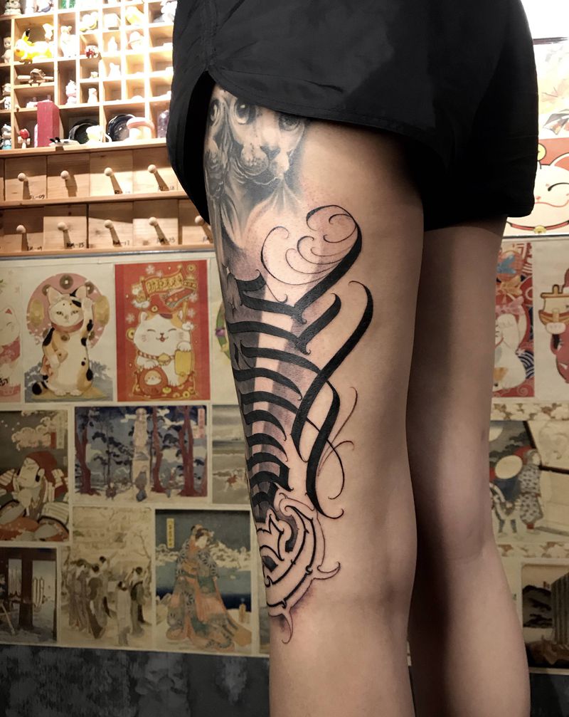• T网红王老大花腿龙纹身图片_腿部新传统纹身图案