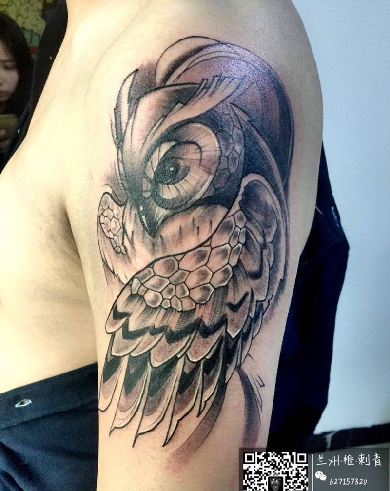 写意猫头鹰纹身图片_成品手臂欧美动物纹身图案