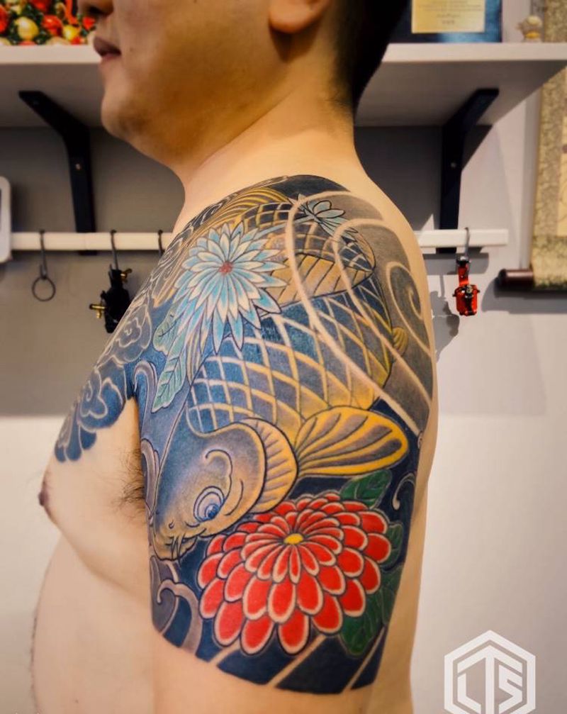 当前位置: 首页 >甘肃省兰州市纹身店-纹路刺青纹身图案>遮盖锦鲤纹身图片_胸部手臂老传统新传统纹身图案