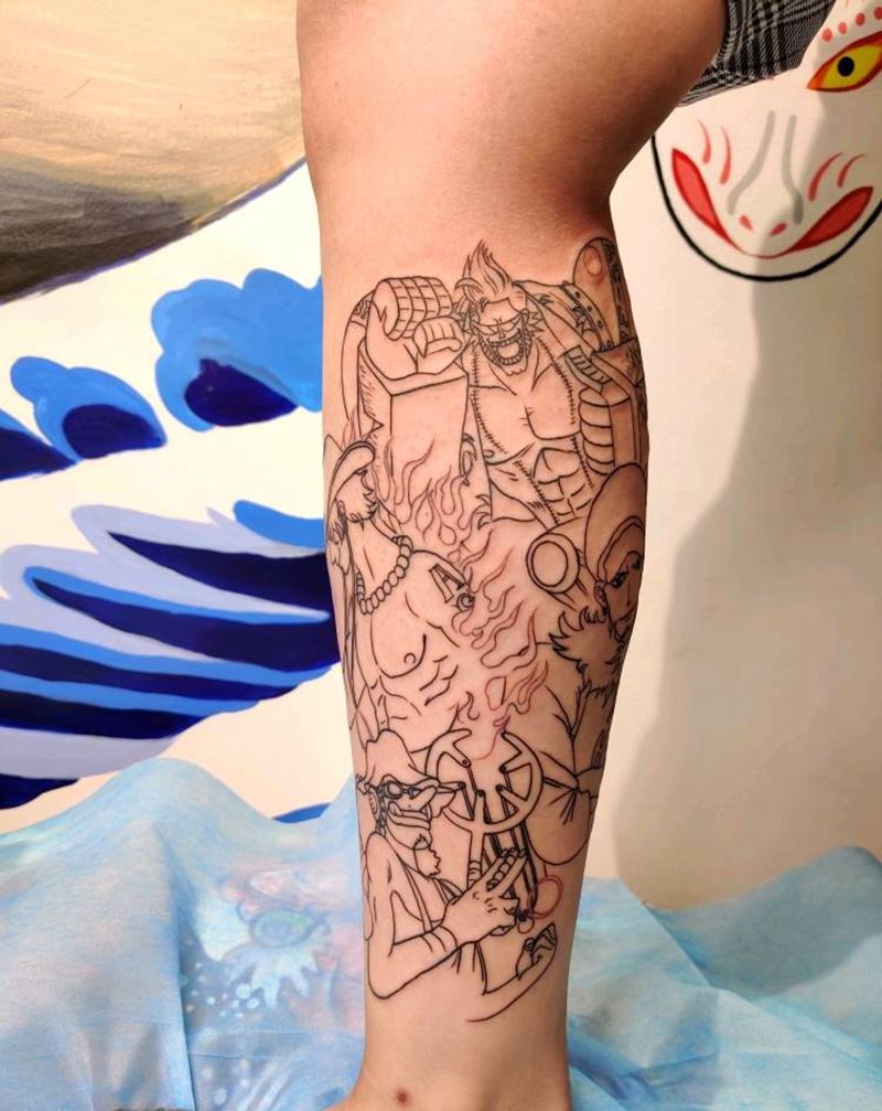 当前位置: 首页 >甘肃省兰州市纹身店-纹路刺青纹身图案>海贼粉纹身图片_腿部New School纹身图案