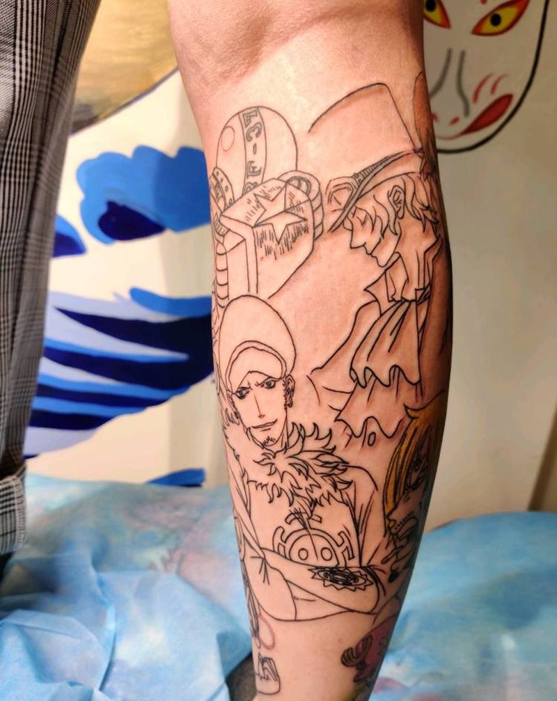 当前位置: 首页 >甘肃省兰州市纹身店-纹路刺青纹身图案>海贼粉纹身图片_腿部New School纹身图案