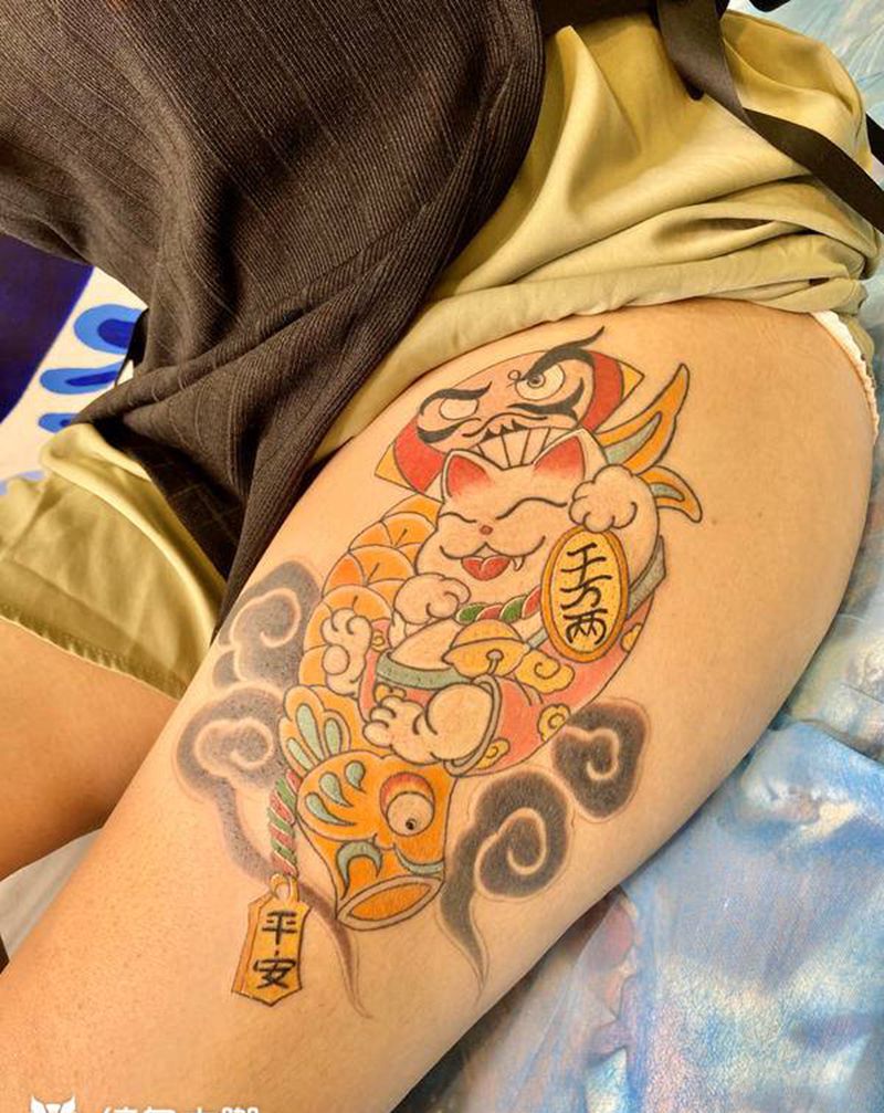腿面招财猫纹身图片_腿部老传统纹身图案