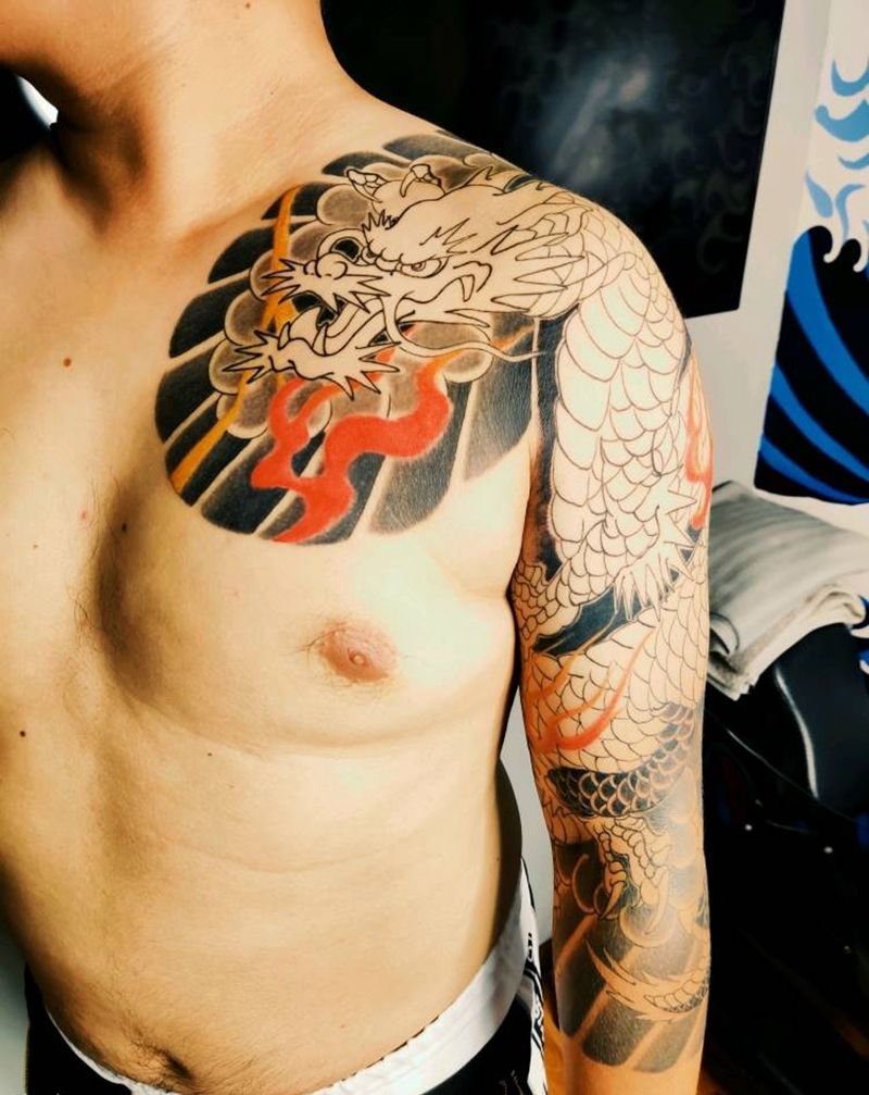 半胛七分袖龙纹身图片_胸部手臂老传统纹身图案