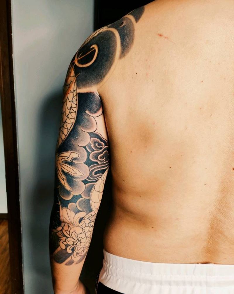 半胛七分袖龙纹身图片_胸部手臂老传统纹身图案