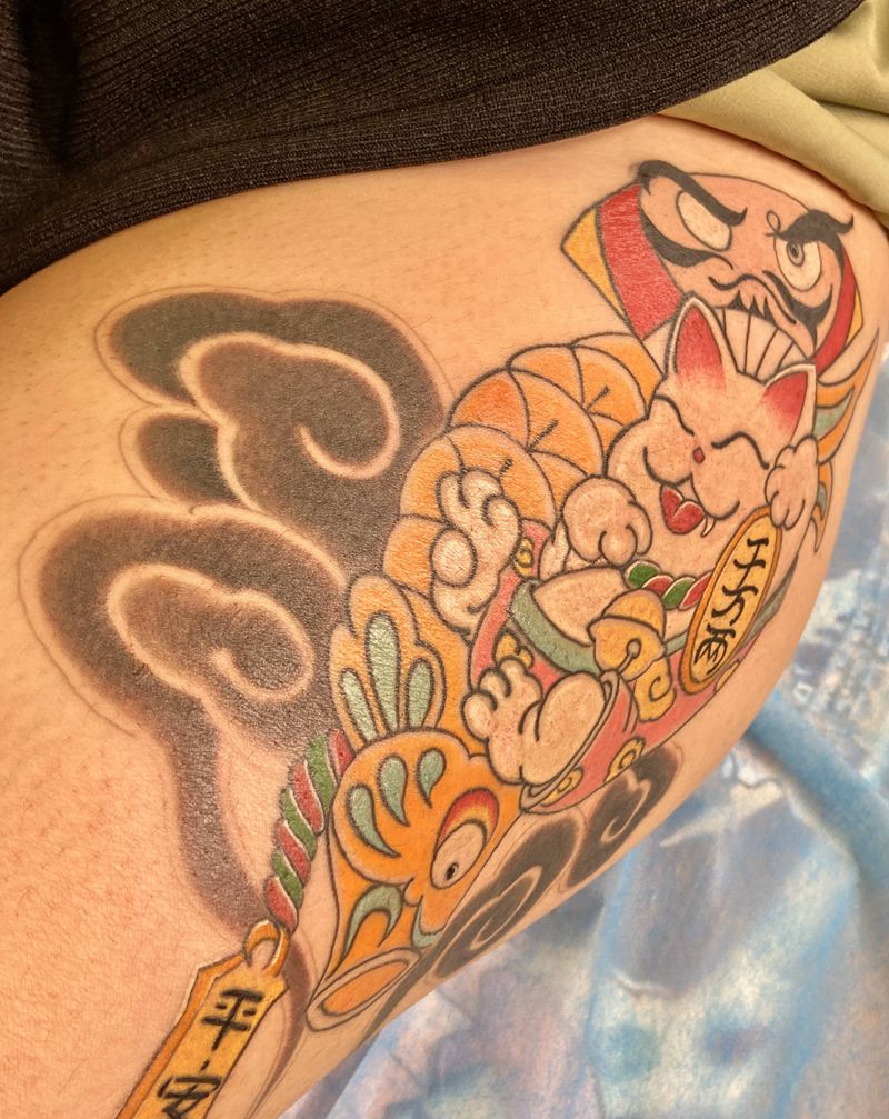 腿面招财猫纹身图片_腿部老传统纹身图案