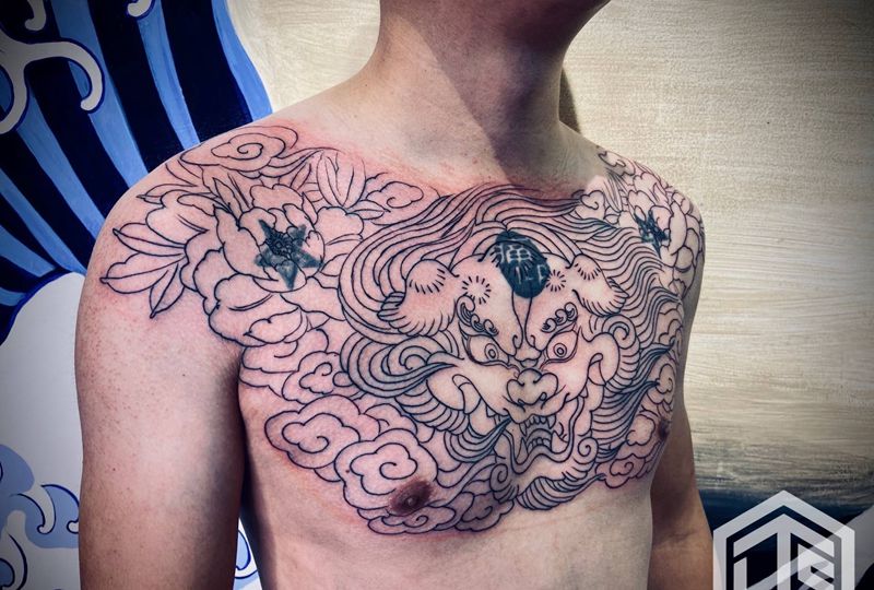 当前位置: 首页 >甘肃省兰州市纹身店-纹路刺青纹身图案>唐狮花胸遮盖,初步线条纹身图片_胸部老传统纹身图案