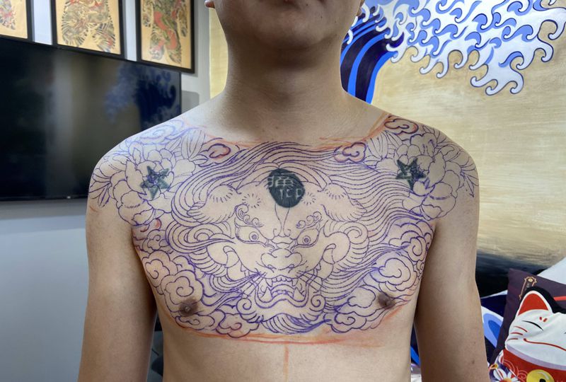 当前位置: 首页 >甘肃省兰州市纹身店-纹路刺青纹身图案>唐狮花胸遮盖,初步线条纹身图片_胸部老传统纹身图案