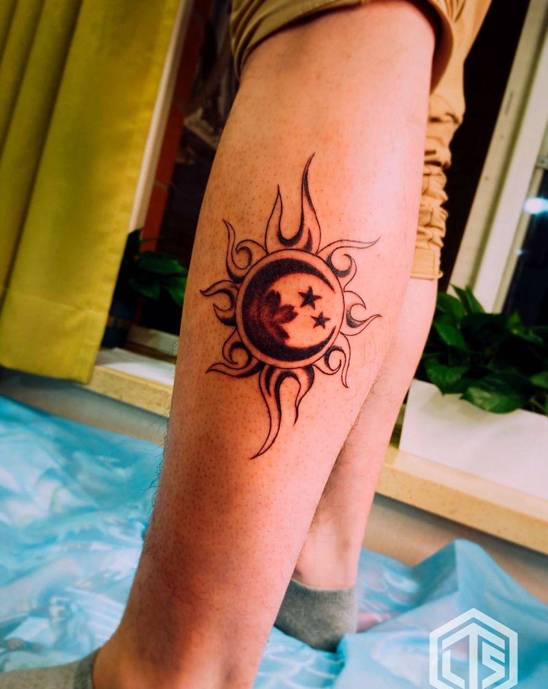 当前位置: 首页 >甘肃省兰州市纹身店-纹路刺青纹身图案>向阳花、太阳月亮纹身图片_腿部新传统欧美写实纹身图案