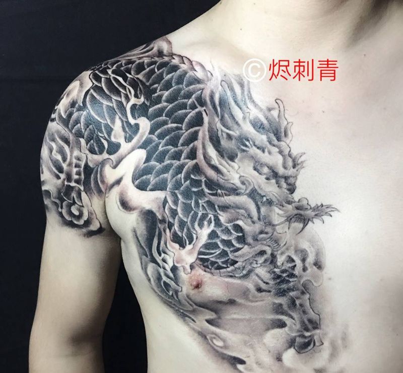 当前位置: 首页 >甘肃省酒泉市纹身店-烬刺青工作室纹身图案>麒麟纹身图片_成品胸部肩部传统鬼神动物图腾纹身图案
