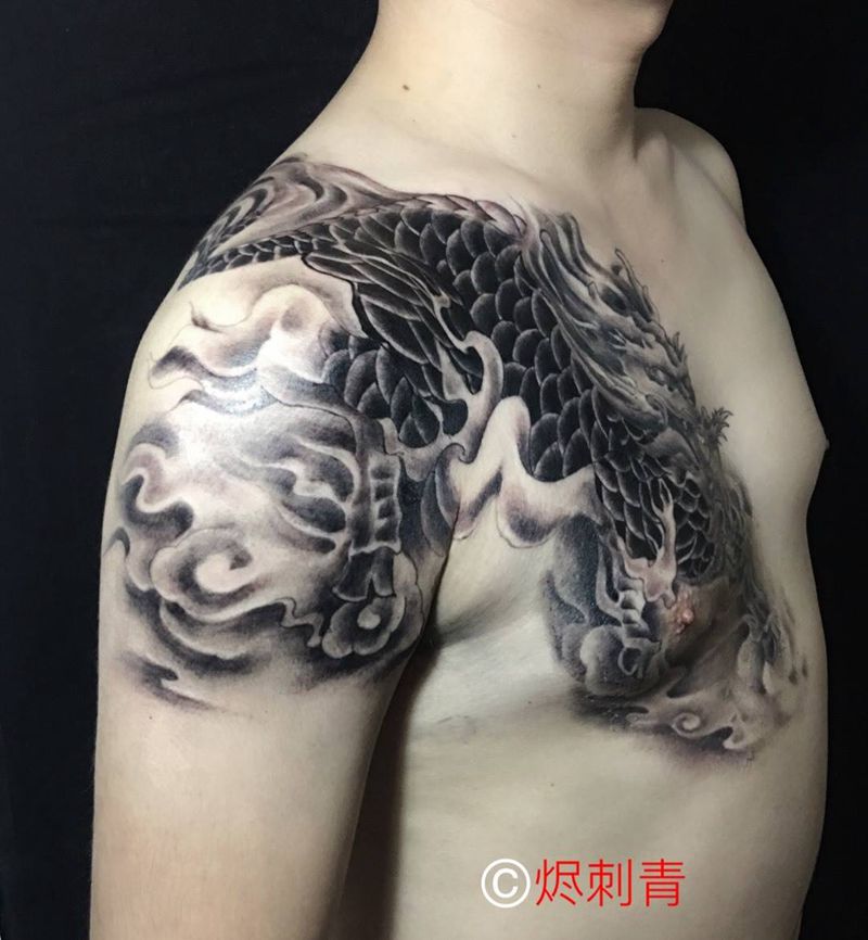 当前位置: 首页 >甘肃省酒泉市纹身店-烬刺青工作室纹身图案>麒麟纹身图片_成品胸部肩部传统鬼神动物图腾纹身图案