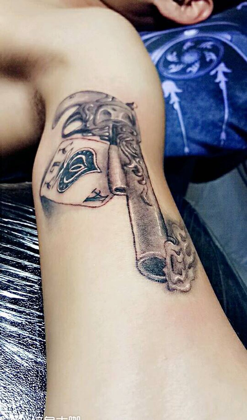 当前位置: 首页 >甘肃省酒泉市纹身店-烬刺青工作室纹身图案>枪纹身图片_手臂欧美写实成品纹身图案