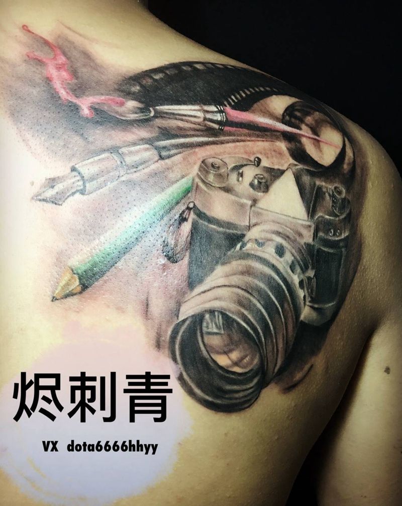 写实相机纹身图片_成品背部肩部写实欧美静物纹身图案