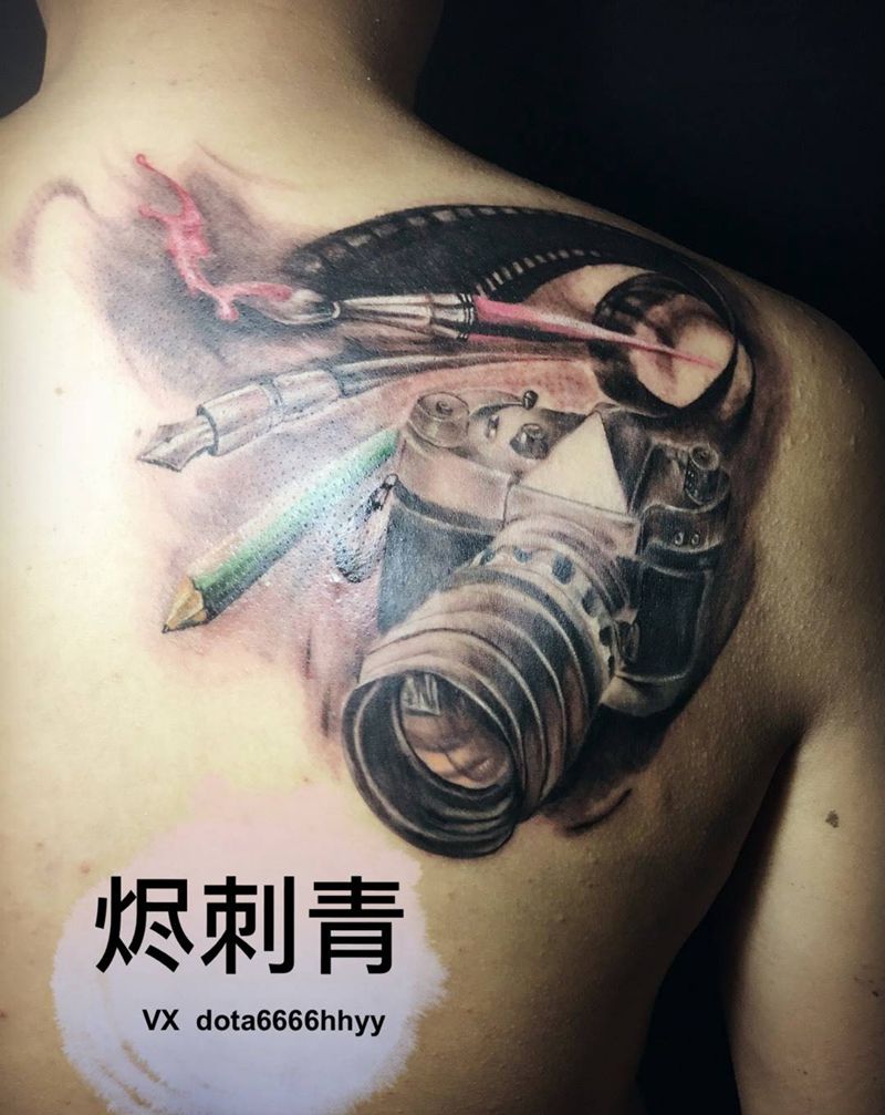 当前位置: 首页 >甘肃省酒泉市纹身店-烬刺青工作室纹身图案>写实相机纹身图片_成品背部肩部写实欧美静物纹身图案