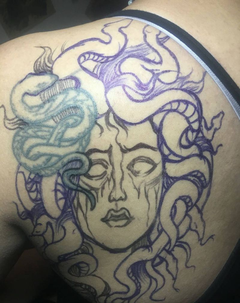 当前位置: 首页 >甘肃省酒泉市纹身店-烬刺青工作室纹身图案>美杜莎纹身图片_成品背部传统欧美肖像人物宗教图腾纹身图案
