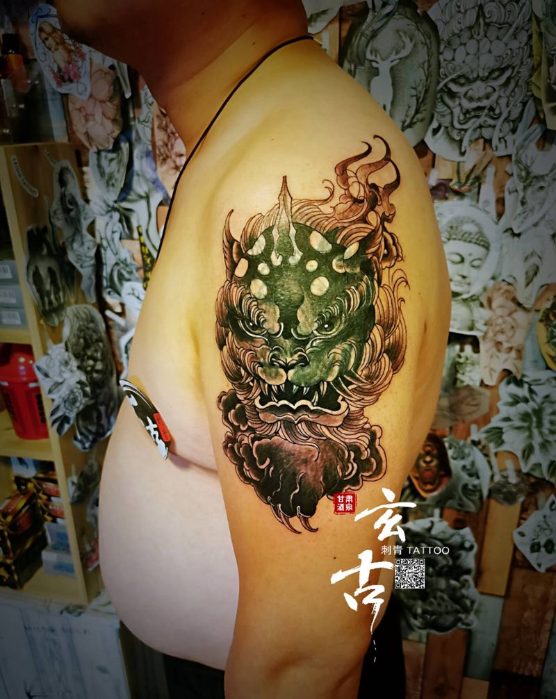当前位置: 首页 >甘肃省酒泉市纹身店-玄古.刺青纹身图案>唐狮纹身图片_手臂新传统纹身图案