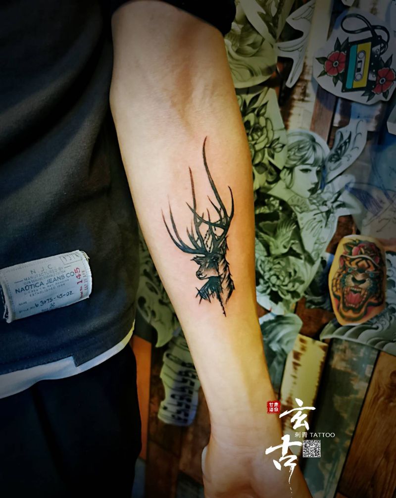 当前位置: 首页 >甘肃省酒泉市纹身店-玄古.刺青纹身图案>麋鹿纹身图片_手臂水彩点刺纹身图案