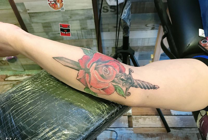 当前位置: 首页 >甘肃省酒泉市纹身店-玄古.刺青纹身图案>玫瑰插刀纹身图片_手臂新传统纹身图案