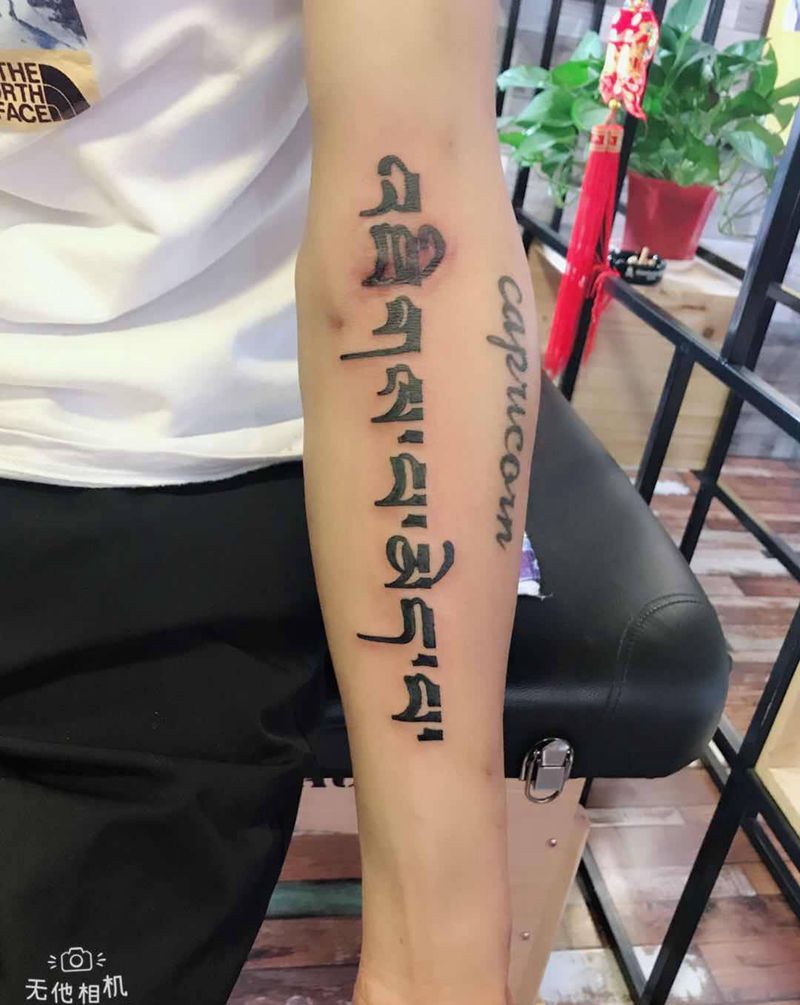 当前位置: 首页 >甘肃省酒泉市纹身店-玄古.刺青纹身图案>无所畏惧梵文纹身图片_手臂花体字纹身图案