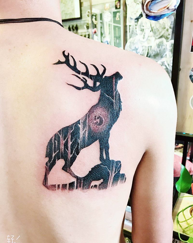 当前位置: 首页 >甘肃省酒泉市纹身店-玄古.刺青纹身图案>麋鹿纹身图片_背部点刺图腾纹身图案