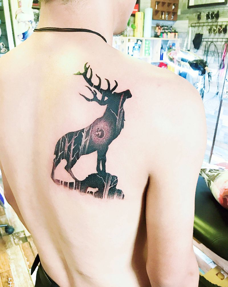 当前位置: 首页 >甘肃省酒泉市纹身店-玄古.刺青纹身图案>麋鹿纹身图片_背部点刺图腾纹身图案