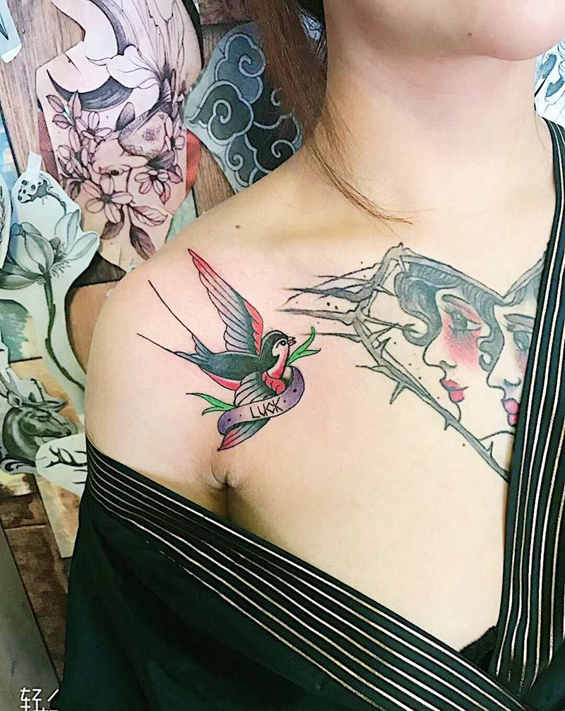 Oldshool燕子纹身图片_胸部Old School纹身图案