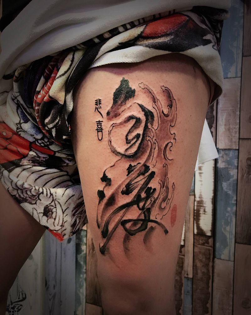 当前位置: 首页 >甘肃省酒泉市纹身店-玄古.刺青纹身图案>自渡纹身图片_腿部水墨花体字纹身图案