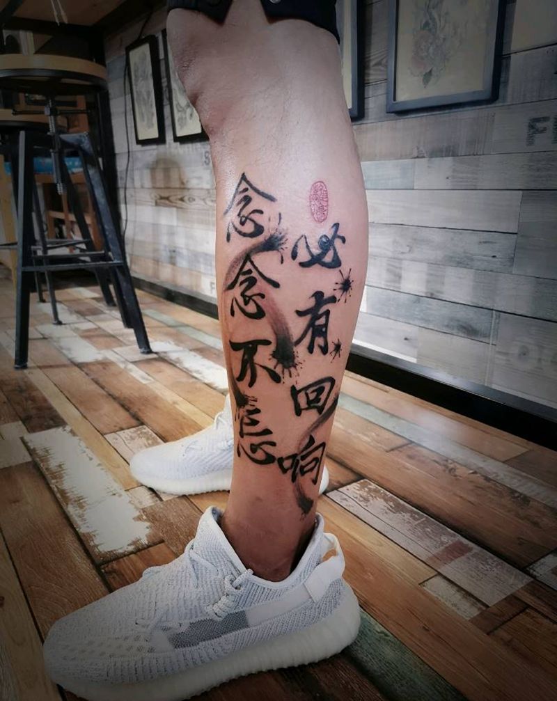 当前位置: 首页 >甘肃省酒泉市纹身店-玄古.刺青纹身图案>书法泼墨纹身图片_腿部花体字水墨纹身图案
