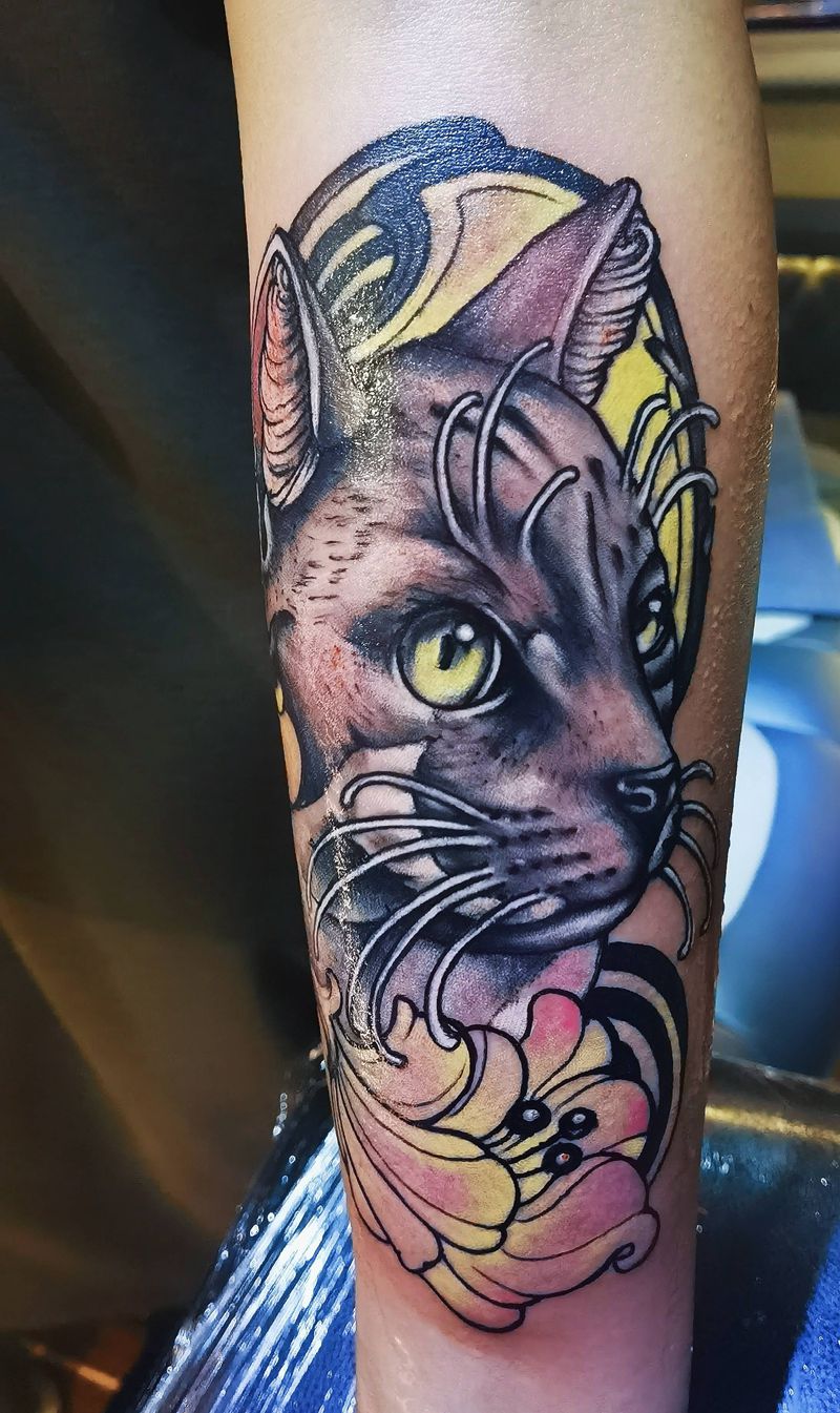 当前位置: 首页 >甘肃省酒泉市纹身店-海峰刺青纹身图案>猫咪纹身图片_手臂水彩纹身图案