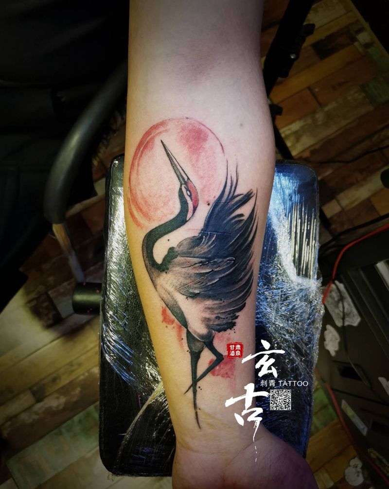 当前位置: 首页 >甘肃省酒泉市纹身店-玄古.刺青纹身图案>鹤纹身图片_手臂水墨纹身图案
