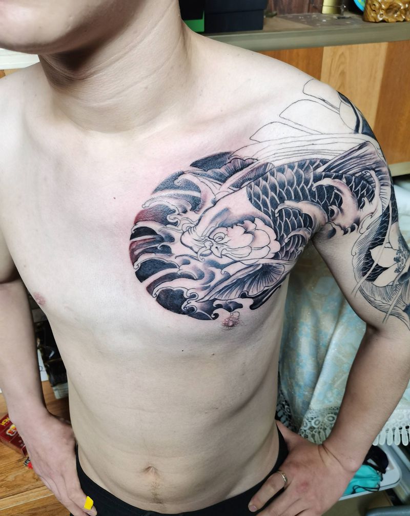锦鲤未完待续纹身图片_胸部手臂新传统纹身图案
