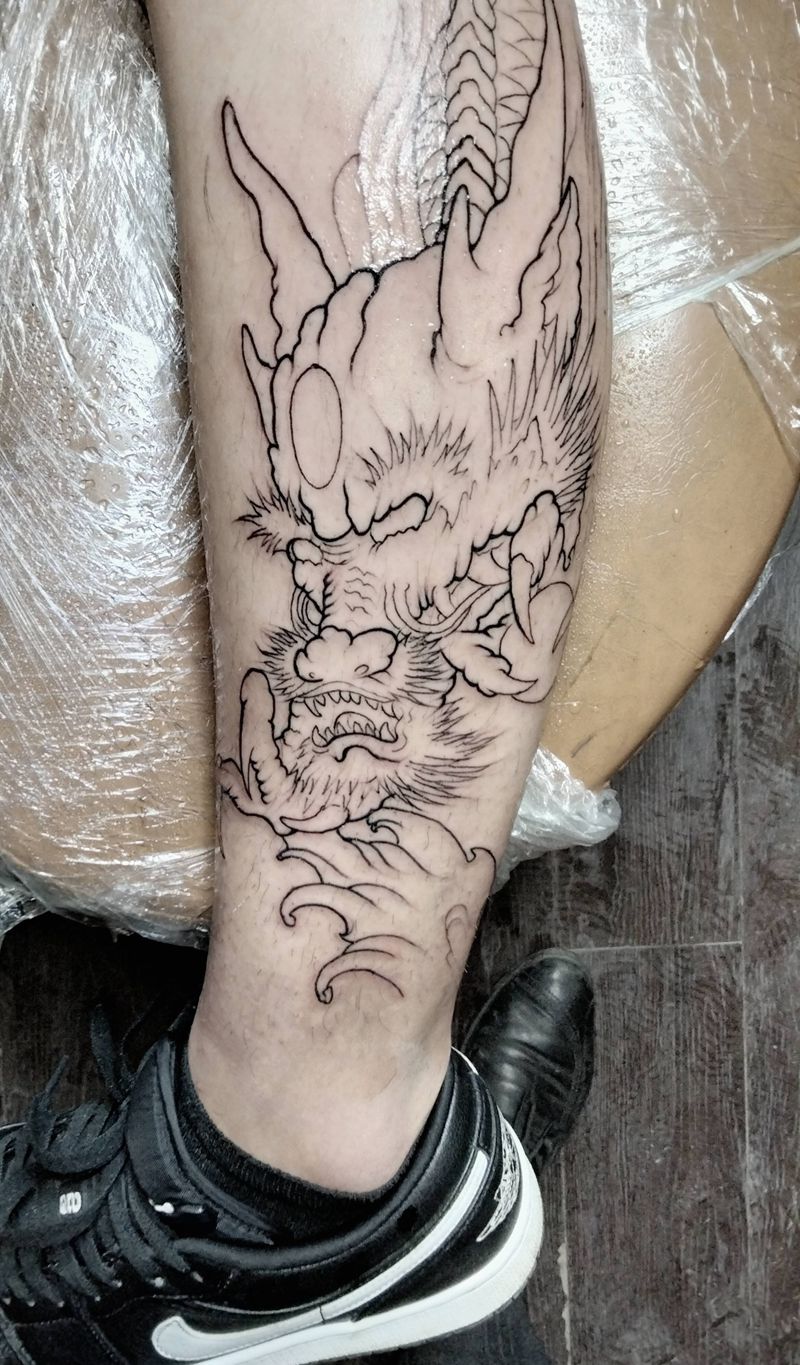龙线条纹身图片_腿部新传统纹身图案