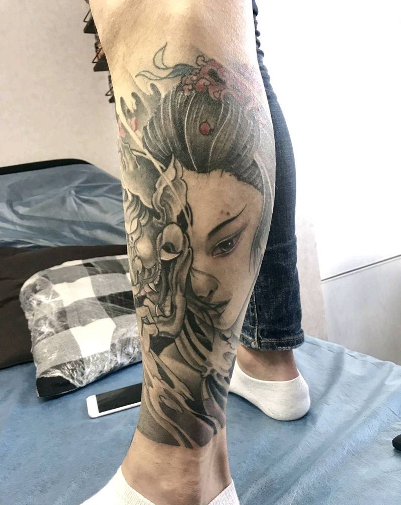 当前位置: 首页 >青海省西宁市纹身店-西宁·墨客刺青纹身图案>艺伎般若纹身图片_腿部新传统纹身图案