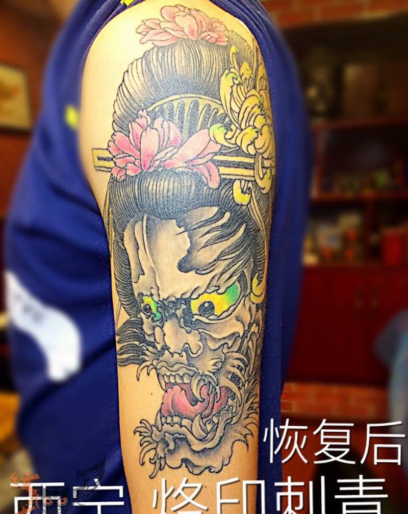 变形艺妓纹身图片_成品肩部传统人物鬼神纹身图案