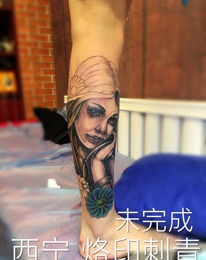 • T包小腿吹火男+阿多福纹身图片_腿部老传统新传统吹火男阿
