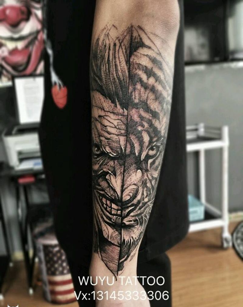 小丑与老虎纹身图片_手臂点刺纹身图案