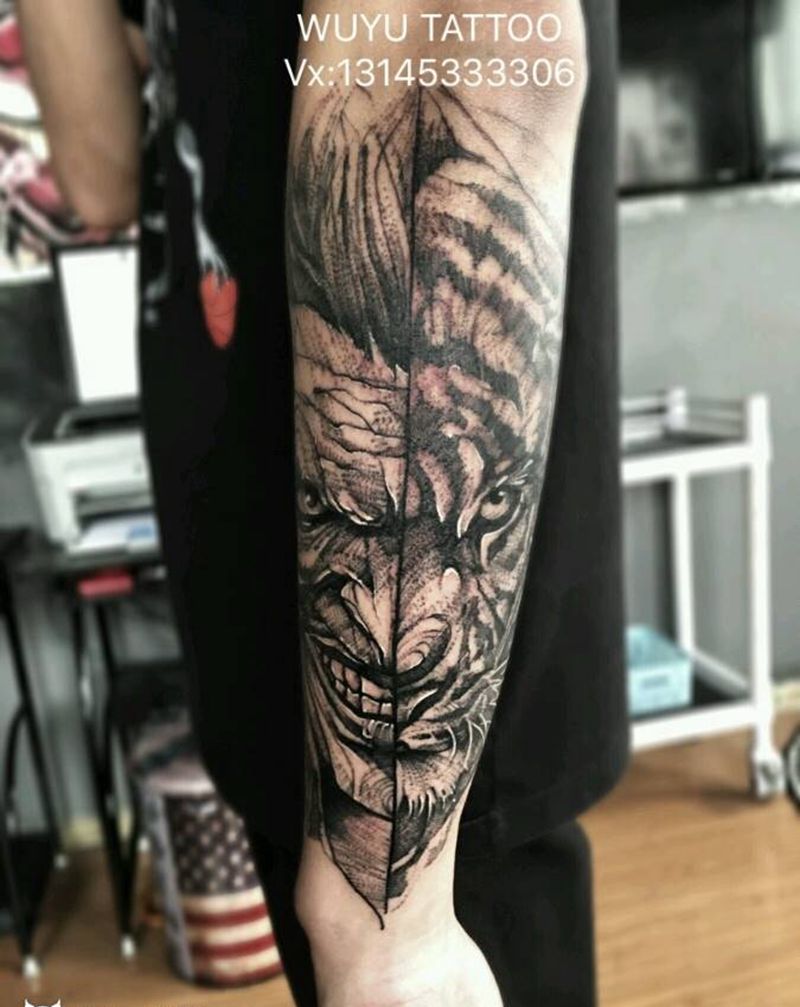 当前位置: 首页 >青海省西宁市纹身店-忆青春纹身工作室纹身图案>小丑与老虎纹身图片_手臂点刺纹身图案