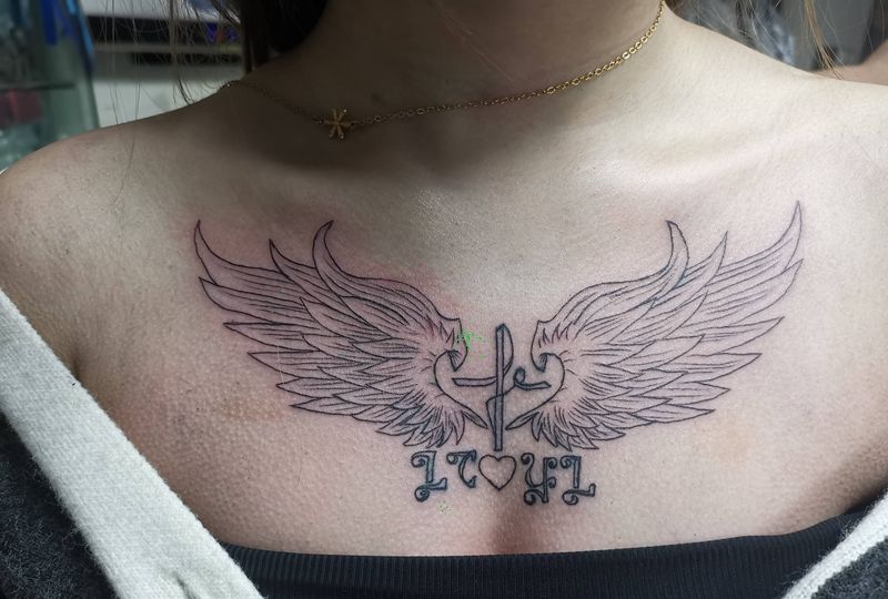 梦想的翅膀纹身图片_胸部New School几何翅膀十字架花体字纹身图案