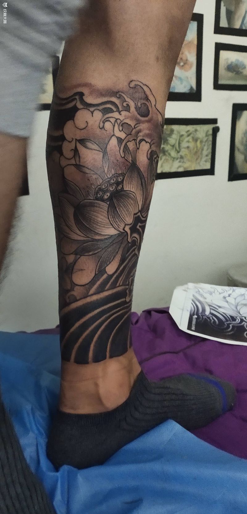 衔接包小臂纹身图片_腿部新传统荷花水浪纹身图案