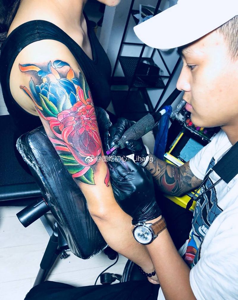 当前位置: 首页 >青海省西宁市纹身店-墨臣刺青纹身图案>菊花纹身图片_肩部手臂新传统菊花重彩纹身图案