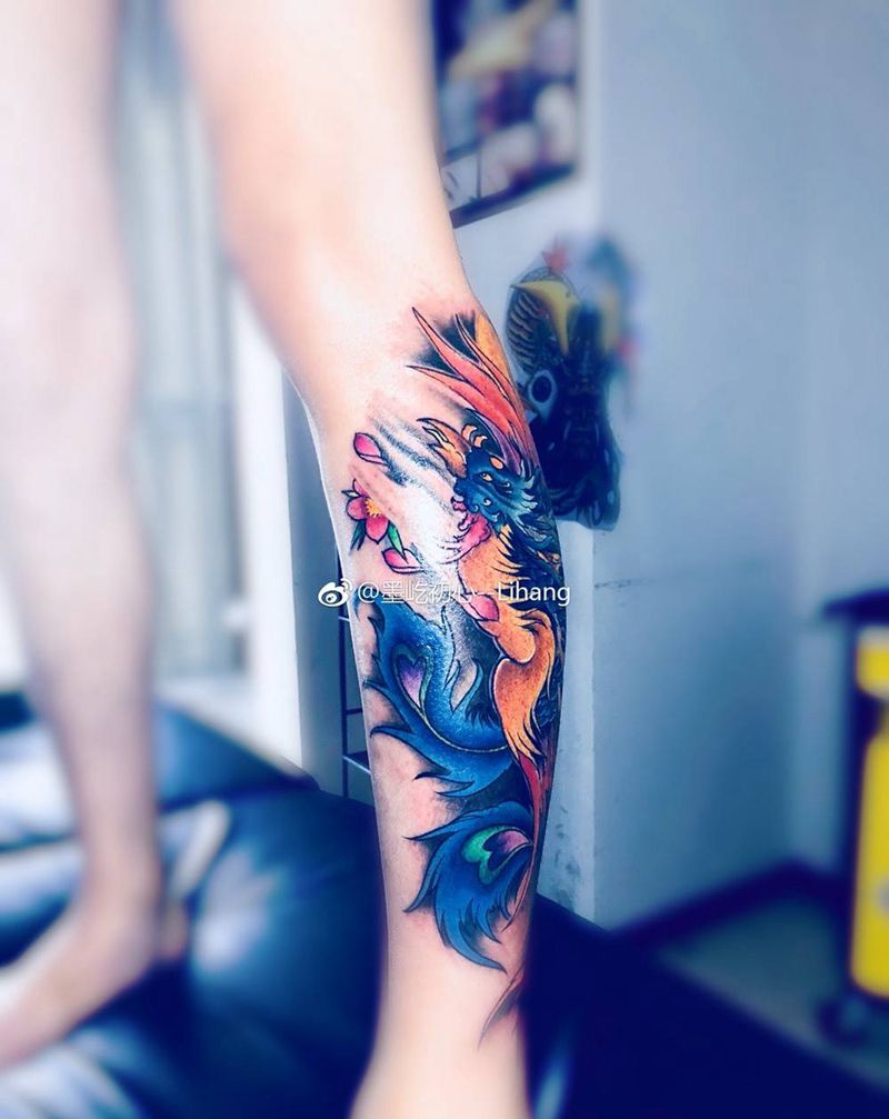 凤凰纹身图片_腿部新传统重彩凤凰纹身图案