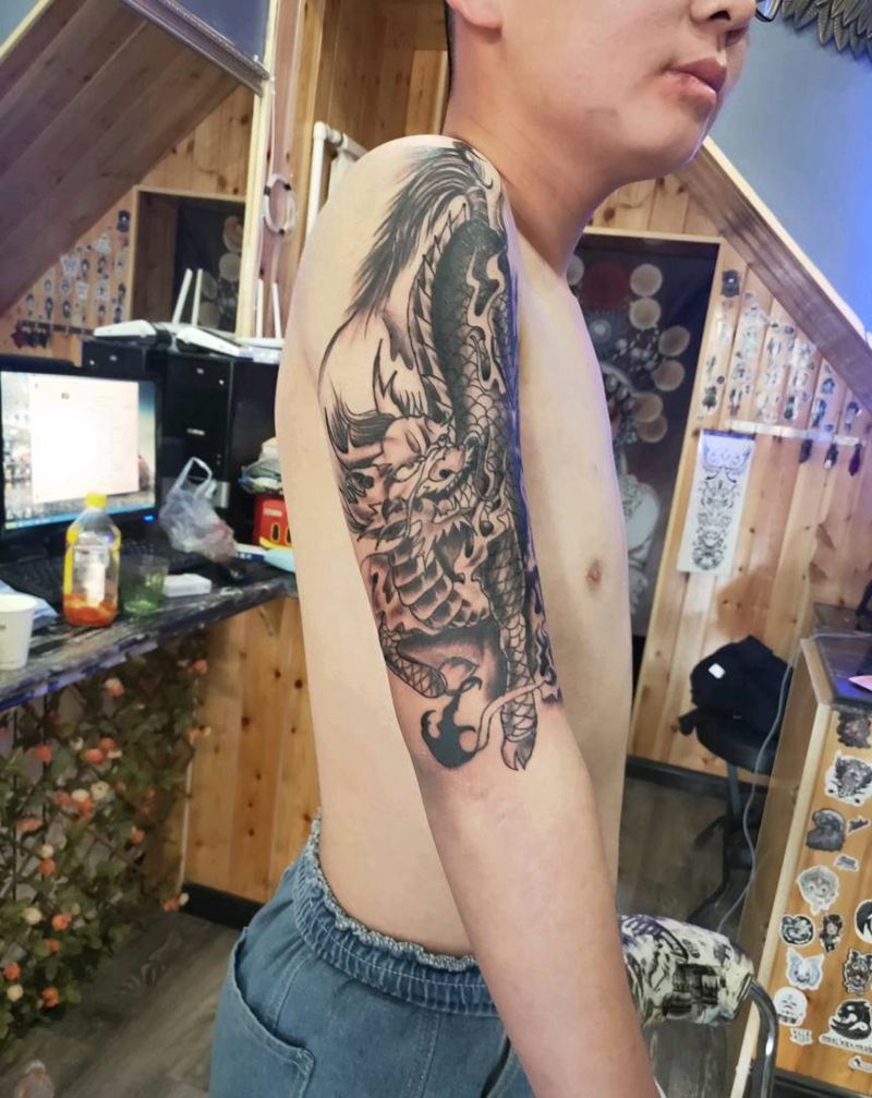 • T网红王老大花腿龙纹身图片_腿部新传统纹身图案