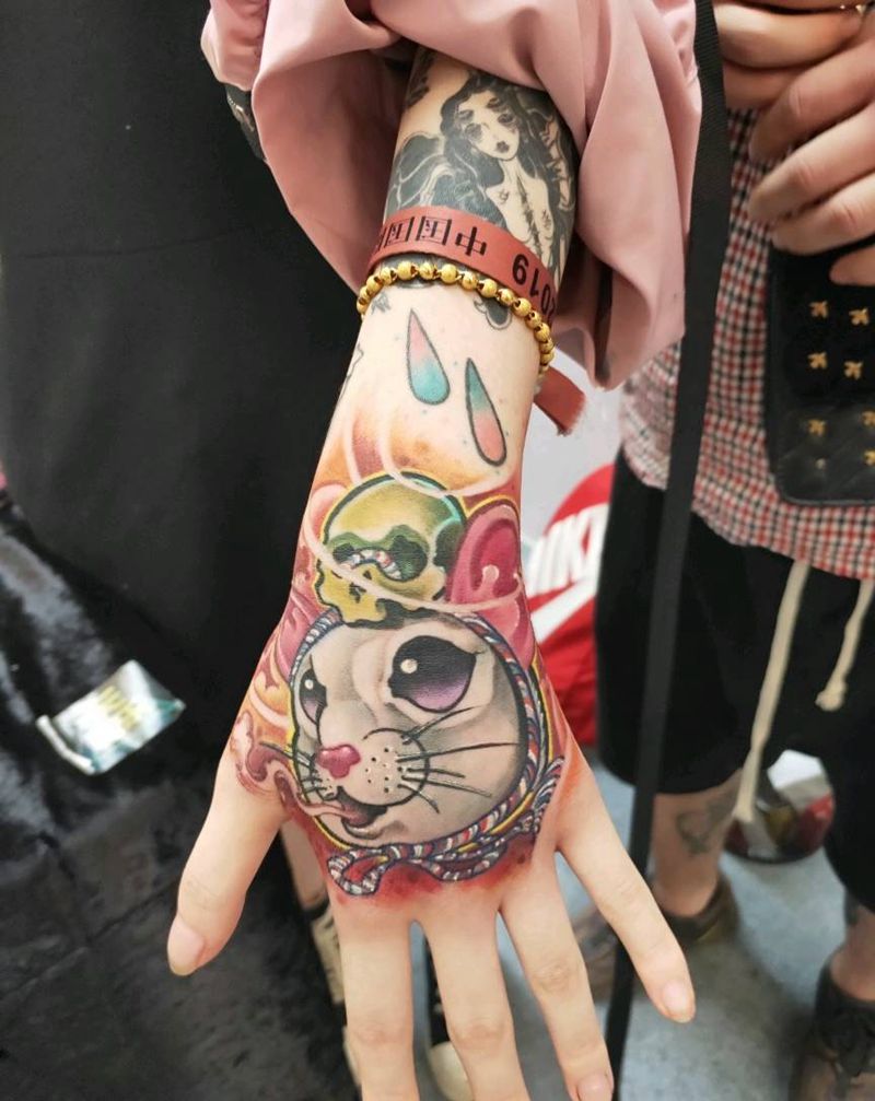 • 手背潮流时尚的玫瑰花眼睛纹身图案