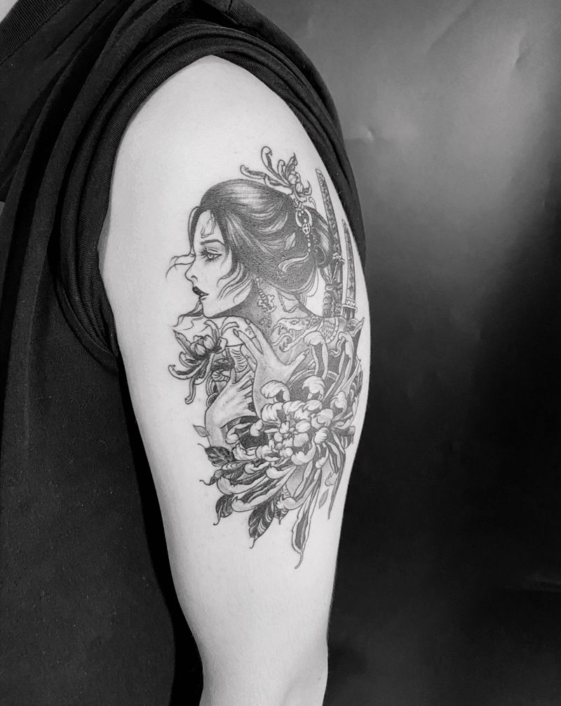 当前位置: 首页 >宁夏银川市纹身店-银川市金凤区佛陀刺青店纹身图案>艺妓纹身图片_手臂纹身图案