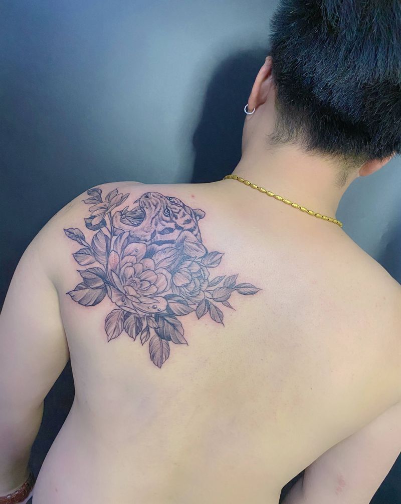 虎嗅蔷薇纹身图片_肩部纹身图案