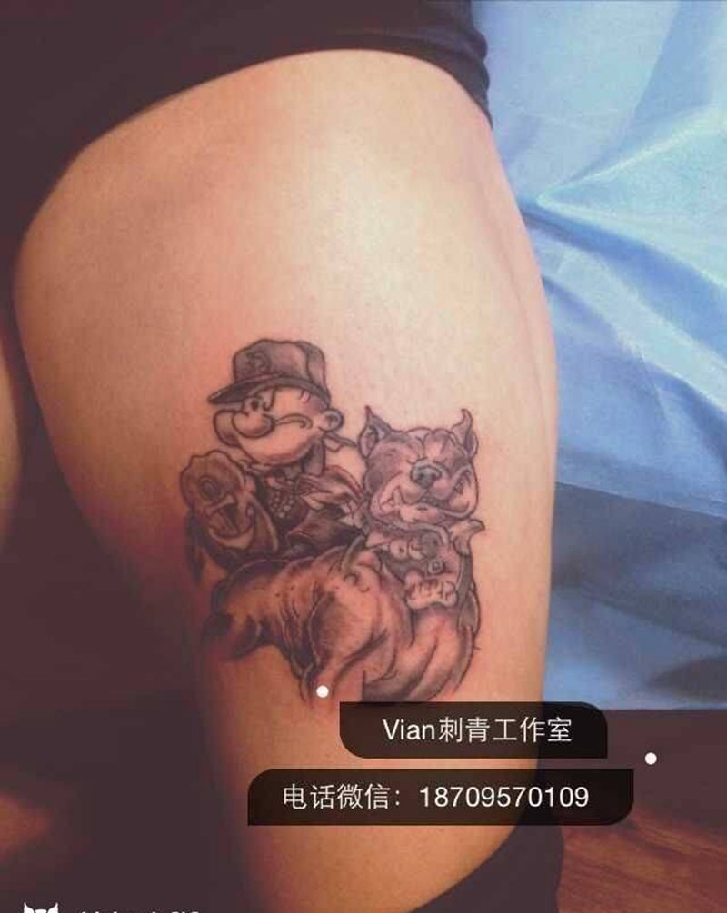 • T包小腿吹火男+阿多福纹身图片_腿部老传统新传统吹火男阿